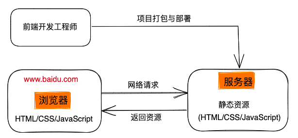 - 浏览器会找到对应的服务器地址,请求静态资源(可以存放在世界上任何一个地方)