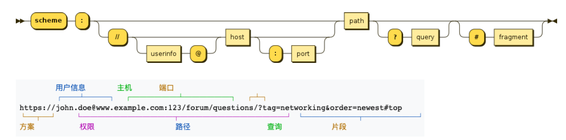 [协议类型]://[服务器地址]:[端口号]/[文件路径][文件名]?[查询]#[片段ID]