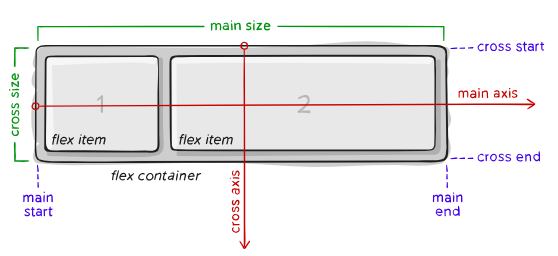 - 容器默认存在两根轴:水平的主轴(main axis)和垂直的交叉轴(cross axis)