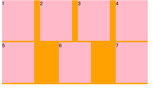 - 当元素个数为7,第2行还是有4个元素:div.item5, div.item6, div.item7, 新元素,占满