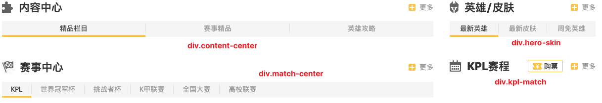 - div.kpl-match元素中导航div.item_header和其他三个有所不同,多了一个购票链接