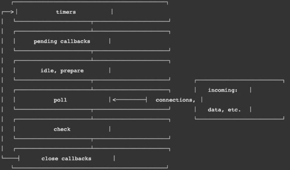 定时器(Timers):本阶段执行已经被 setTimeout() 和 setInterval() 的调度回调函数待定回调(Pending Callback):对某些系统操作(如TCP错误类型)执行回调,比如TCP连接时接收到ECONNREFUSEDidle, prepare:仅系统内部使用轮询(poll):检索新的 I/O 事件;执行与 I/O 相关的回调检测(check):setImmediate() 回调函数在这里执行关闭的回调函数:一些关闭的回调函数,如:socket.on(‘close’, …)