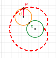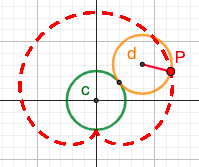 • 要求圆c与圆d相切,选取切点P为外摆线轨迹原点,当动圆d绕着定圆c的外侧逆时针滚动时,点P形成的轨迹就是外摆线