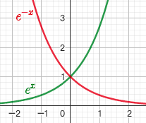 • 图像在第一象限内接近于曲线 $y=e^x$,在第三象限接近于曲线$y=-\frac{e^{-x}}{2}$